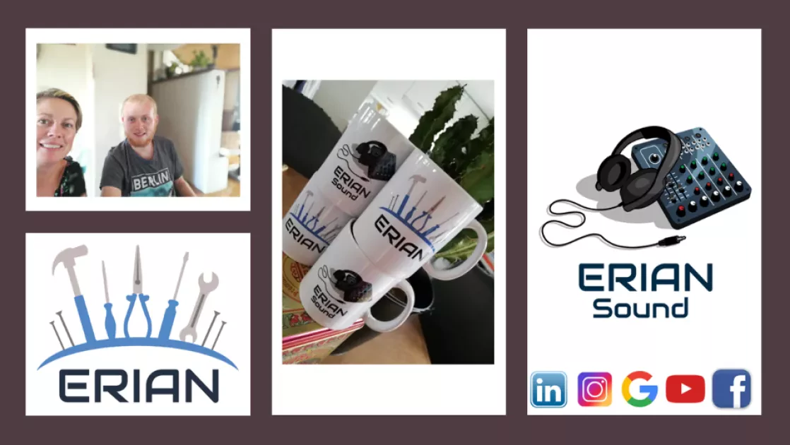 2) Aan de hand van het Handelsregister bedenken we zijn naam/concept en maken zijn logo op. Voor Erian werd gekozen voor zijn eigen UNIEKE naam. Deze is kort, krachtig en blijft met een gepaste visual "direct" hangen. Erian heeft 2 takken waarop hij wil werken (Klussen en Geluid). Mogelijks wordt dit nog uitgebreid, want hij blijft opleidingen volgen. Zijn doelgroep is divers. We verkozen dan ook om te gaan voor 1 hoofdbrand met een duidelijke visual én met daaronder subbrands. Erian - Erian Sound.